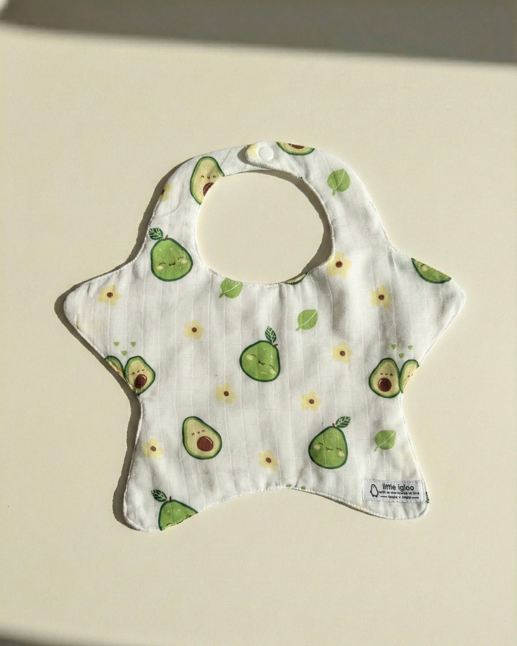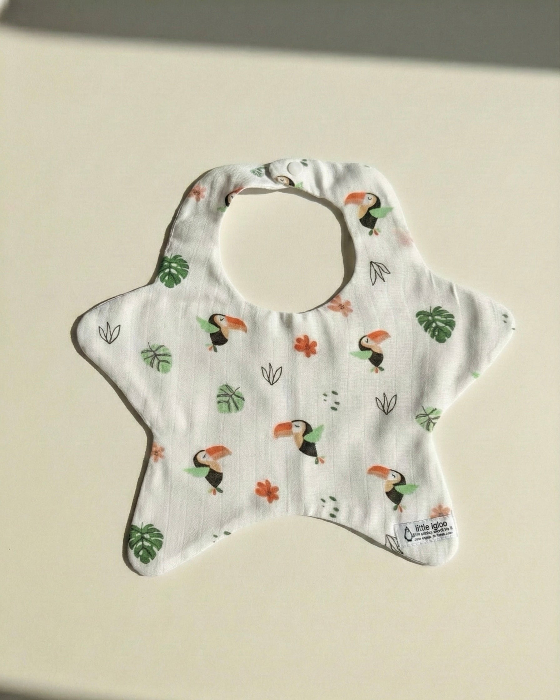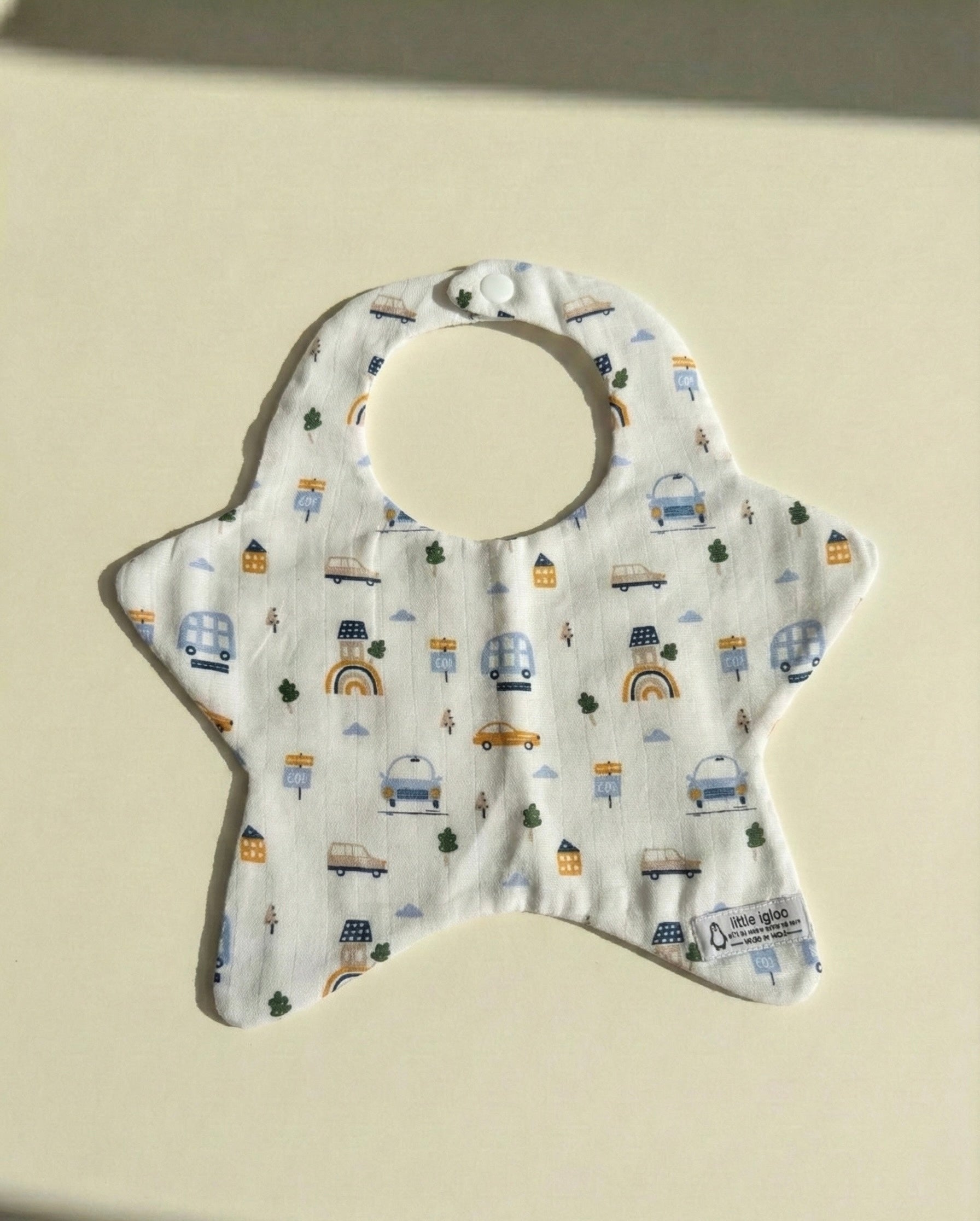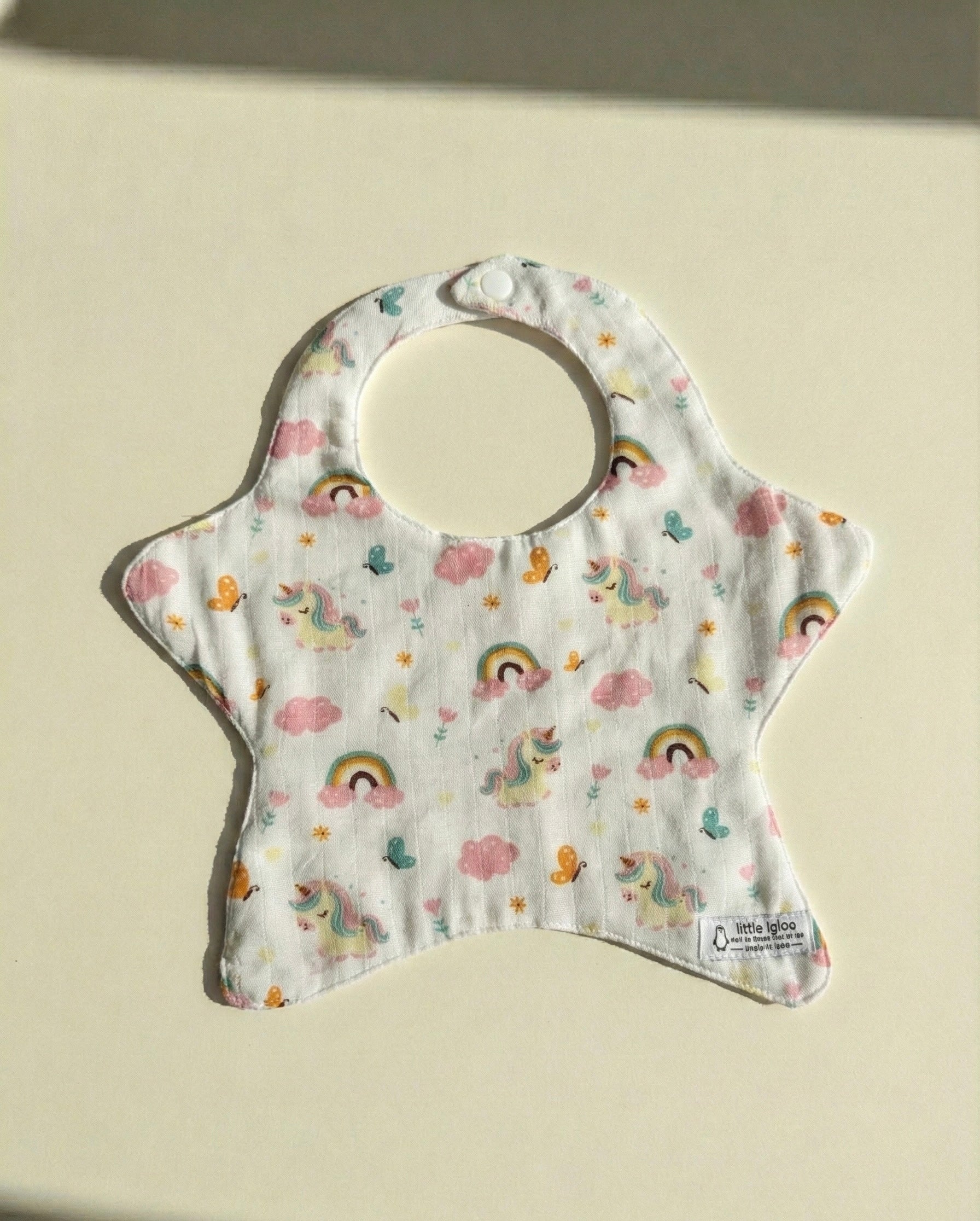Wrap your little one in softness with our 100% premium cotton muslin star-shaped bibs. Designed for comfort and charm, these bibs are ultra-light, naturally breathable, and gentle on delicate baby skin. The unique star silhouette adds a playful touch while offering full coverage for drools, dribbles, and tiny meal-time messes.